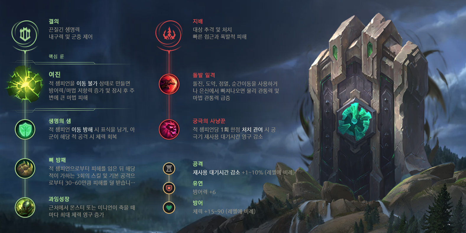 칼바람 레오나 룬은 QER 3개의 CC를 보유한 레오나와 효율성이 좋은 결의의 여진 룬을 추천합니다. 기본으로 방어 W를 보유하고 있는 레오나의 경우 뼈 방패까지 더해져 초반부터 좋은 탱킹력을 보입니다. 또, CC가 많아 아군의 체력을 회복할 수 있는 생명의 샘과 가장 잘 어울리는 챔피언 중 하나가 레오나죠. 리그오브레전드(league of legends)는 건물을 밀어야 이기는 게임이라서 철거 역시 나쁘진 않습니다. 그리고 근처 몬스터 또는 미니언이 죽을 때마다 최대 체력이 영구 증가하는 과잉 성장을 추천합니다.